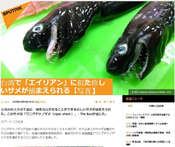 台灣「外星怪魚」紅到外國!行政院農委會水產試驗,去年12月進行海域魚類調查時,意外在台東河鄉外海深處,發現5條罕見的「卡氏尖頷烏鯊」的小型鯊魚,這神奇的小鯊魚還讓英國《太陽報》、《每日郵報》,以及日本等國外媒體,爭相搶著報導。