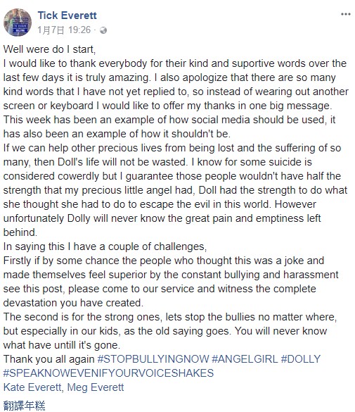這位14歲的女孩朵莉 (Amy Dolly Everett) 小時候還拍攝過帽子公司的廣告,是個善良又善解人意的美麗女孩,朵莉的爸媽表示,女兒的去世讓他們的「世界都崩塌了」,於是他們決定發起一場網路運動來打擊網路霸凌行為。