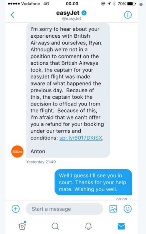「萊恩,我很抱歉聽到你關於英國航空和我們的遭遇,雖然我們沒有立場評論英國航空的行為,但是你搭乘的EasyJet航班的機長有被警告你前一天發生的事件,因此,機長決定不讓你登機,所以基於這些情況,我們恐怕無法退還你訂購機票的費用。」「喔好吧,那我想我們只好法庭見了,謝謝你的幫忙朋友,祝你一切安好」