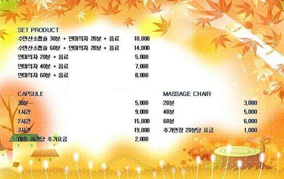 14. 这是价目表,氧气胶囊约是每20分钟300至400元台币左右,另外还有按摩椅等等可以放松一下喔!