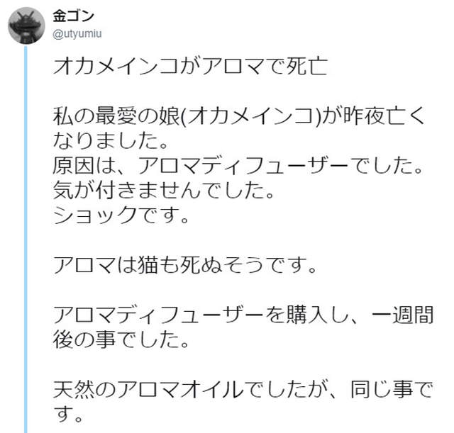 2. 只是她這篇PO文是要告解的,因為她說她最愛的雞尾鸚鵡死掉了,而死掉的原因是她使用了芳療機,鸚鵡因為精油而死亡,就連貓咪也差一點點就死掉。雖然她強調是天然的精油,但是卻還是會害死寵物。