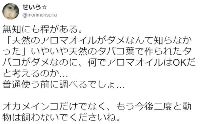 4. 而這位女網友的PO文很快就讓不少人看不下去,紛紛抨擊她,像是有人說重話指出無知也要有個程度,用精油前至少也要先查一下會不會有什麼影響,並且拜託她別再養寵物了。