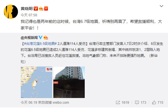 206花蓮大地震,災情不斷,讓不少演藝明星紛紛在第一時間,透過公眾人物的影響力,紛紛為台灣祈福,而始終為第一位關心台灣的中國演員的黃曉明與妻子Angelababy,一知道消息後,也分別在微博特地PO文關心,黃曉明回憶起2年前的台灣台南也發生6.7級的地震,擔心的說:「祈禱別再震了,希望救援順利,大家平安」。