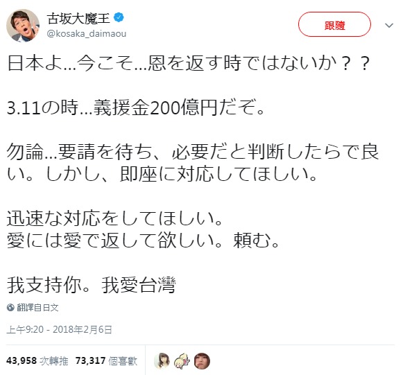不只一般網友響應喊話,就連日本藝人Piko太郎 (古坂大魔王) 也特地在推特上發文表示:「日本阿…現在…不就正好是我們來報恩的時候了嗎??311地震時,台灣捐款了200億日圓是吧。當然先判斷怎樣幫助是對的,但我也希望大家能夠出現即時的應對幫助。想要有快速的對策,也想要用愛來報答愛,拜託了!」最後更用中文打上「我支持你。我愛台灣。」