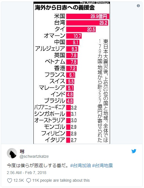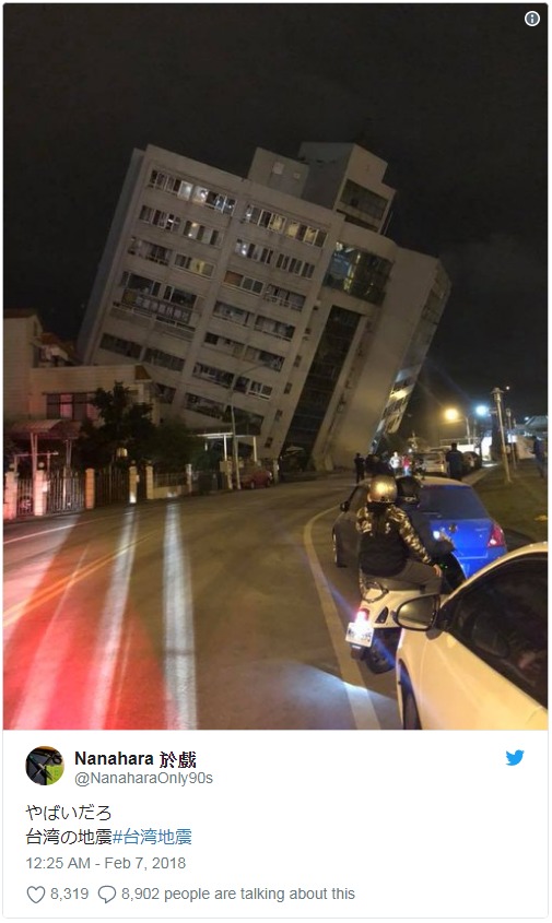 6日晚間台灣花蓮發生規模6.0的地震,沒多久便傳出災情,一些房屋傾斜、倒塌,或是地面隆起龜裂,情況嚴重,這項消息很快就傳到其他國家,大家也紛紛報導這次台灣的地震事件。而在網路上更是造成很大效應,日本網友紛紛以「#台湾地震」、「#台湾加油」等標籤來為台灣祈福。