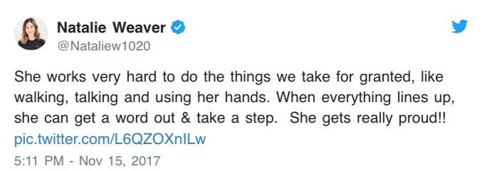「她很努力從事那些我們視為理所當然的活動,譬如走路、說話、運用雙手。一切順利時,她總能說出一個字、踏出一步。她很自豪!」
