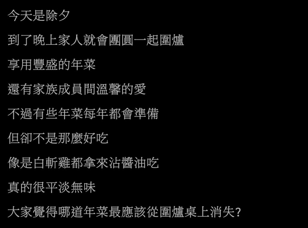 除夕夜大家都會回家吃飯,傳統習俗裡這天除了大家團圓外,還會大掃除、吃年夜飯。不過近日有網友在PTT上發文表示「最希望哪一道年菜在圍爐時消失?」,網友說:「今天是除夕,到了晚上家人就會團圓一起圍爐,享用豐盛的年菜,還有家族成員間溫馨的愛。不過有些年菜每年都
