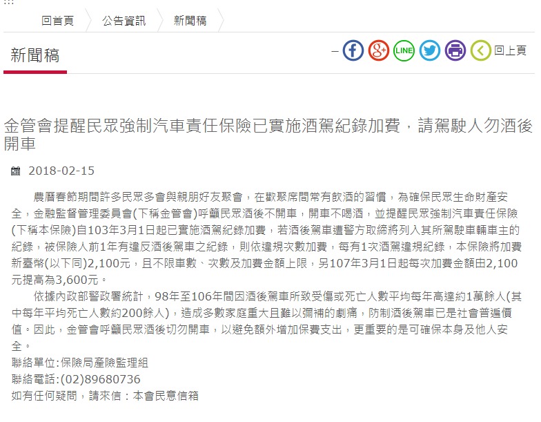 保險局透露,因為酒駕肇事屢見不鮮,也讓強制汽車險理賠酒後駕車金額不停提高,為了反映理賠成本,因此認為加費費率也需要提高才行,希望民眾可以因此更加警惕,新制也在3月開始上路。
