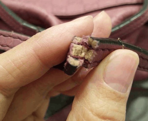 马女爆料指出,她发现手把中间的材质,看起来就像纸一样,真的只要手指一捏就断,她立刻把该包包拿回GUCCI专卖店询问,也拿出一张在GUCCI专卖店购买的单据当证明,示意自己不是去其他地方买的仿冒品。