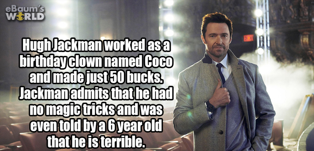 10. 休傑克曼曾扮演一位名叫Coco的生日派對小丑,只賺了50美元 (約台幣1千4)。他坦承自己不會變魔術,還被一位6歲小孩嫌很爛。