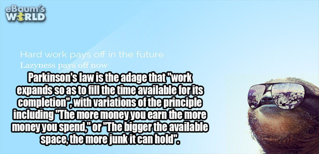 16. 帕金森定律闡述「時間有多長,工作就會有多長」,認為「你賺越多錢就會花越多錢」和「空間越大垃圾就越多」。