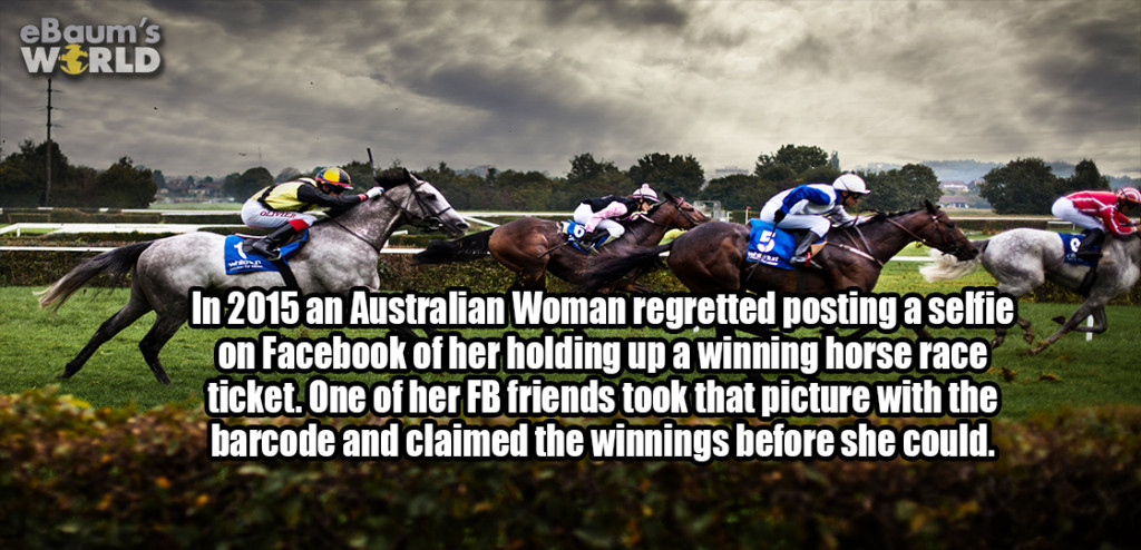 17. 2015年一位澳洲女子後悔在臉書PO了一張她贏得賽馬的票。她的一位臉友竊取了照片中的條碼趁她領獎之前偷走了她的獎金。