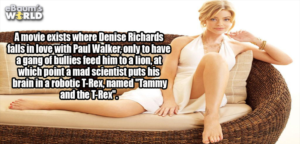 18. 女星丹妮絲理查茲在一部電影裡愛上保羅沃克,後來讓一群混混把他餵給一頭獅子,接著一名瘋狂科學家將他的腦袋放進一個機械暴龍裡。那部電影叫《百變侏羅紀》。