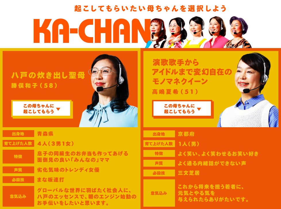 au表示他們統計調查指出,日本有66.5%的上班族擔心早上會起不來,造成上班遲到,因此他們決定推出這樣的貼心服務,讓人有種在家的感覺,他們還特地找來10名「地方媽媽」,每個人都有的不同的口音和方式來叫你起床,讓遊子也能享受媽媽的貼心叫喚。