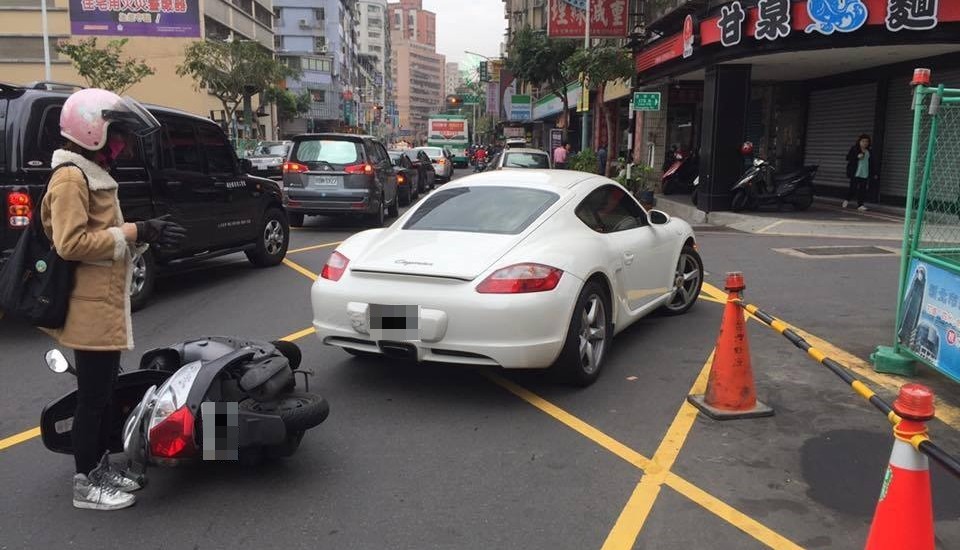 最近仙女咪在路上总是看到一些名贵轿车,身为「宝炼一族」还是远观就好,但新北市这位女骑士就没这么幸运,15日出门上班时明明天气很好,没想到却不小心撞上一台百万保时捷,当下自己的车倒了却没发现……