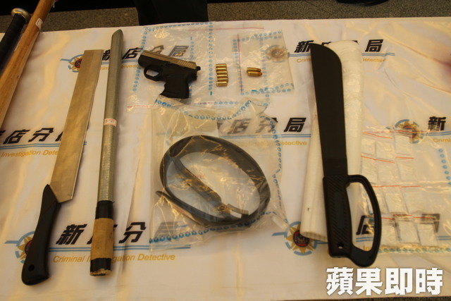 對此新店分局指出,去年年底他們接獲5起有關蔡男的報案,最後由刑案專責組檢察官李彥霖成立專案後,在蔡男女友台北市住處逮捕了蔡男,除了在堂口查獲道具槍1支、子彈2顆、開山刀1把和西瓜刀2把之外,還有K他命毒品數十包,以及被害人們的本票和借據等等,蔡男和小弟一行8人被依組織犯罪妨害條例、毒品、槍砲刀械、重傷害等罪嫌移送法辦。