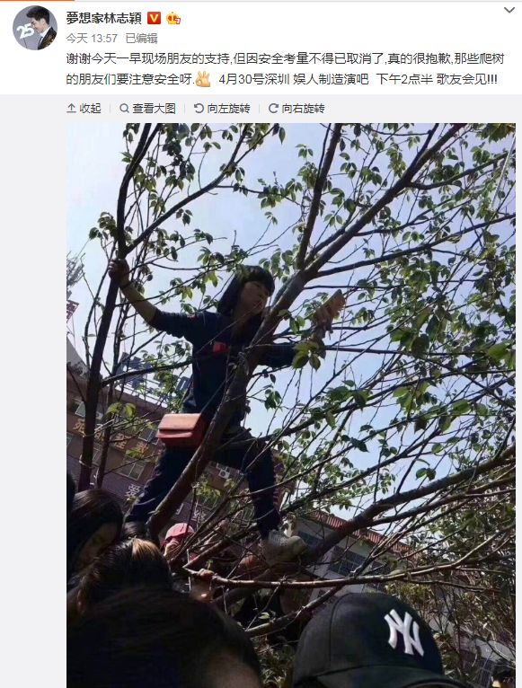 當年的小旋風至今仍是小旋風啊!林志穎出道25年來人氣始終不降反而越來越高,27日原定在河南南陽出席活動,沒想到現場人潮擠爆,甚至還有民眾爬樹待命,猶如「惡靈古堡」般的失控場面,結果主辦方為了安全考量,不得已將活動取消。為此,林志穎還錄了一段影片,感謝粉絲們的支持,也發文表示,「那些爬樹的朋友們要注意安全呀!」。