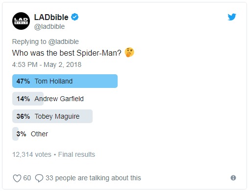 雖然由湯姆·霍蘭德所飾演的蜘蛛人獨立電影目前只有一部,但他在其他漫威的電影中也都非常搶眼,和先前2位蜘蛛人比起來也更加年輕。根據國外網站《LADbible》的票選結果,年僅21歲的湯姆·霍蘭德以47%的得票數,成為網友們心中「最棒的蜘蛛人」。