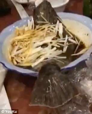 根據《每日郵報》報導,5月2日時,一群人正在中國某餐館用餐,桌上擺著一道伴有洋蔥及醬油的蒸比目魚,突然,熱騰騰的比目魚竟然大動作跳出盤子,在座的海鮮廚師被嚇到跳離座位,目瞪口呆的看著「明明已經煮熟的魚」。此段影片剛好被錄下並上傳至優酷,後又被傳至YouTube,網友紛紛表示「難道是魚殭屍?」