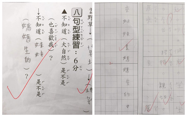 媽媽還指出,之前兒子也曾寫下類似的句子,範例是「不知道…是不是…」,結果他竟然寫,「不知道妹妹是不是媽媽生的?」隔天新的造句又寫,「原來妹妹是媽媽生的」,媽媽無奈地說,「這孩子總算還我清白了!」並搞笑的造了一句,「不知道兒子是不是發現我的秘密了?」。