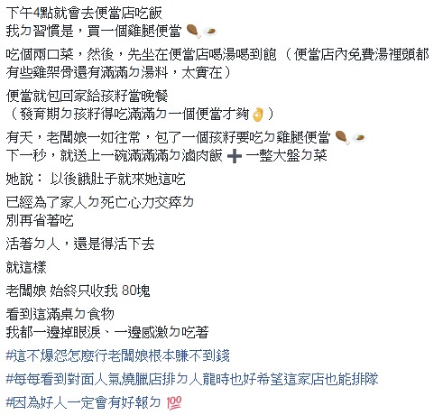 只是有天她一如往常這樣購買時,老闆娘在打包好雞腿便當後,又給了她一碗魯肉飯和一大盤的菜,並暖心地說了一句:「以後餓肚子就來這吃,已經為了家人的過世心力交瘁,別再省著吃了。」事後一樣只收80元,這讓原PO非常感激,一邊掉淚一邊吃著。最後原PO也說老闆娘幾乎就是在做賠本生意,這麼好的人不和大家說一下不行,也希望便當店可以生意心隆,老闆娘會好心有好報。