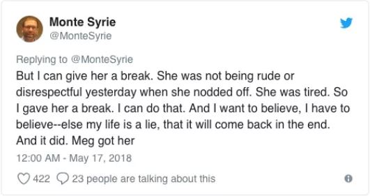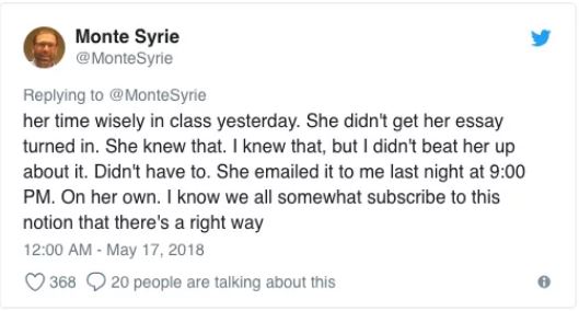 他在推特上寫下他讓學生上課睡覺的原因,他說:「梅根昨天上課時睡著了,我沒有叫醒她,她的生活中還有許多瑣事需要她去操心,我的課只是她生活的一部份,不是她的生活。」