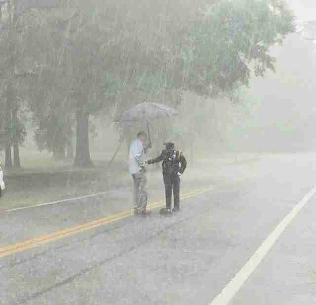 「当我们走近时,我们意识到她站在某个东西旁边。」卡洛琳发现,这名女警的脚边缘来有一只正在马路中间休息的的鳄龟!因为那天的能见度很差,女警担心这只鳄龟被来往的车辆撞到,于是便站在雨中保护着他。卡洛琳说:「我无法相信她在那一场雨中站在那里守护着那只乌龟。没有多少人会这样做,不管他们的职业是什么,她真的尽到了服务和保护生命的责任。」卡洛琳和丈夫深受感动,因此他们也赶紧上前帮这名警察撑伞挡雨。
