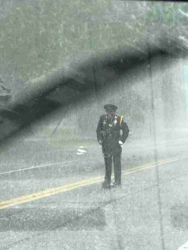 真是太温暖了!美国马里兰州一名女子卡洛琳 (Carolyn BR Hammett) 有天在一个暴雨的下午和丈夫开车经过家附近,结果他们看到了一个很不得其解的画面,因为有一名女警站在滂沱大雨中,没有穿雨衣也没有带雨伞,全身已经湿透了,但是她却露出了一个超灿烂的笑容,一开始卡洛琳觉得很疑惑,以为是因为道路淹水所以这名警察站在路上提醒驾驶,但后来仔细一看才发现原来这名警察这样做是有原因的!