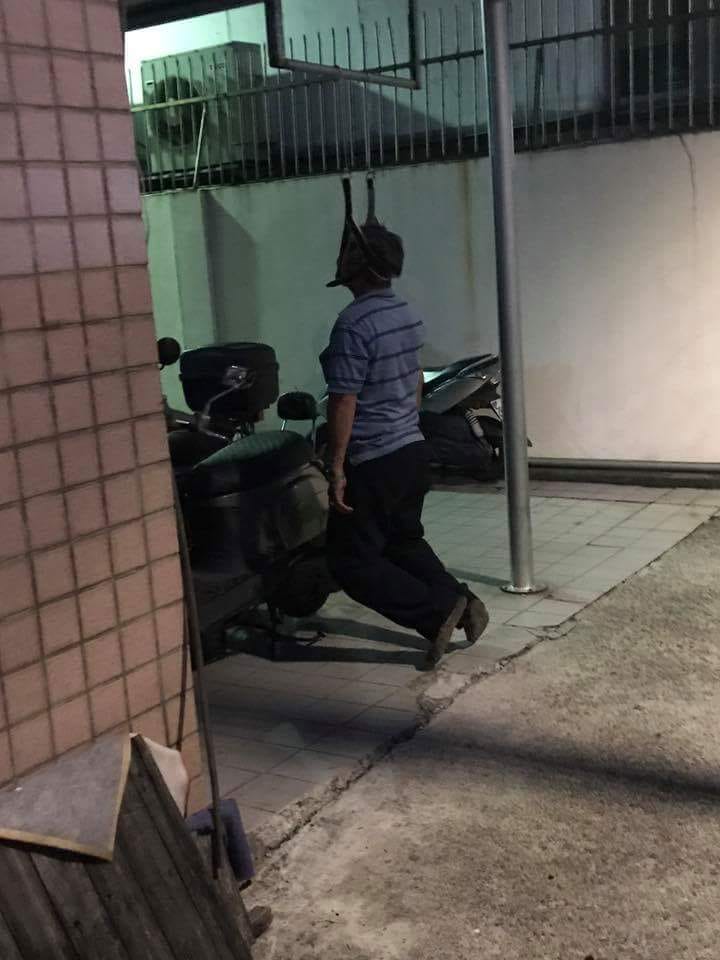 從原PO的照片中可以看到一名男子雙手垂掛在身側,雙腳微微屈膝,脖子上則是套有一個東西,就這樣整個人掛在鐵桿下,這讓原PO以為自己看到命案現場;幸好了解後,原來該名男子是在做吊頸復健,因此才會懸掛在那。