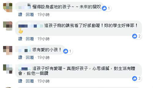 該名男同學的創作讓老師相當感動,並將此文分享到臉書上,寫下「我的暖男學生」稱讚這位男同學的善良。而這篇創作也吸引了許多網友注意,除了大讚男同學小小年紀便懂的換位思考,關懷小動物外,也有網友大推該名男學生的文筆,「四年級就能創作出這麼動人的文字,長大不得了!」但也友網友開玩笑稱「一看就知道絕對是未來的貓奴」。