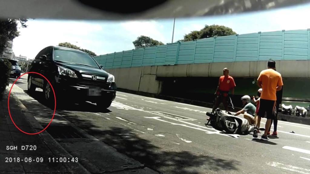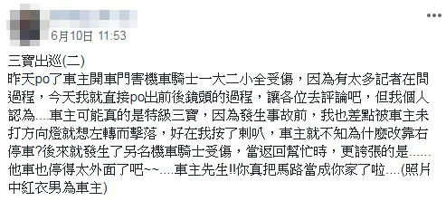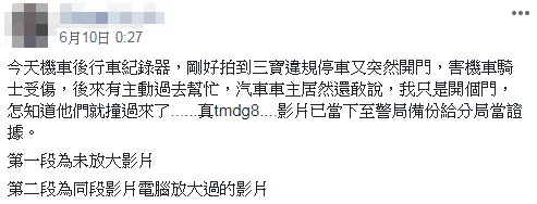 这让原PO听到后非常傻眼,之后不只将影片PO上网,在当下也前往警局备份当作证据;事后网友也补充说这名驾驶应该是「特级三宝」,因为在事故发生之前,该辆轿车也差点因为没有打方向灯而撞到他,结果就在他按了喇叭后,车主也不知道为什么突然靠右停,甚至还几乎停到马路上,最后才发生后续的开门意外。