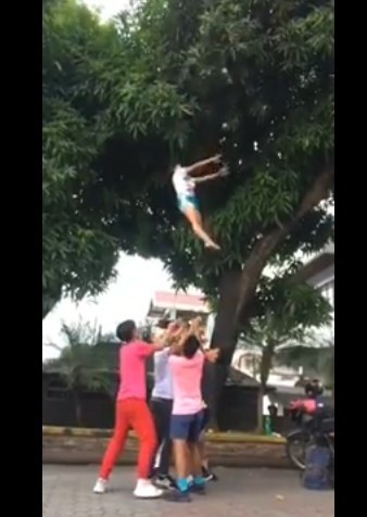 影片中只见树下4名少年先用手合力捧住女孩的脚,接着用力往上一抛,女孩马上就飞到近3公尺高的树上,双手抓下树上结实累累的青芒果,大大小小颗的芒果跟着女孩一起落地。