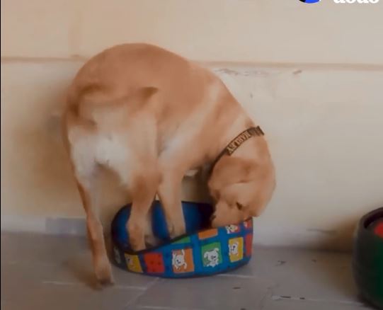 但是,字典裡沒有放棄兩個字的狗哥,決定再次嘗試坐進床裡,而且這次挑戰從另一邊進去,「啊不然我換一邊試試好了!」
