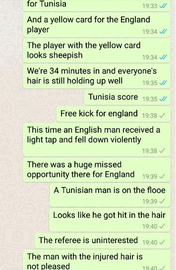 這是英國的第一場比賽,對手是突尼西亞,女友後來在推特上發文表示:「我的男友在回家的路上請我用傳簡訊的方式實況轉播英國隊的比賽,你不能說這報的不精準啊!」