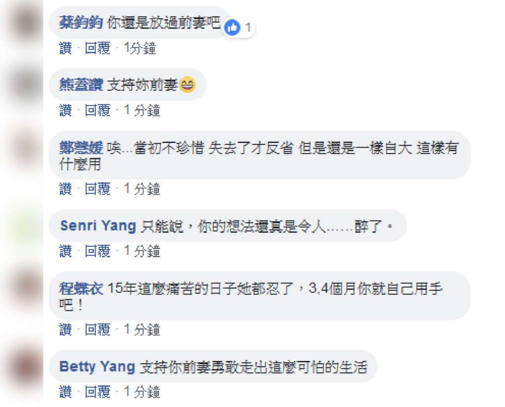網友們看到這篇抱怨文以後火大在下面留言:「還好前妻清醒了,真的離婚剛好!」、「感覺你只是想要免費的『幹』」、「15年換不到幾個月???我也是醉了!」、「你自己有手,不要再欺負她了!」,po文短短3小時就已經累積了近三千則留言,後續男網友沒有在更新任何回應。