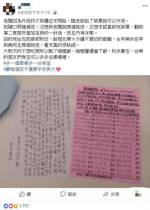 在老爷爷的菜单后面附着一封信,信上不仅写着他熬制汤头的过程不添加味精、人工添加物,更在信中动之以情的告诉大家,他的孙女在去年被诊断患有心脏病,已经从成大医院转至台大,目前正在住院等待换心手术。「我孙女(4岁)从去年到台北台大儿童医院等待心脏移植手术,这段期间已经耗费很多的金钱,所以目前急需用钱,我以想拜托您,如果有需要叫外送的话,可否给我们有这个机会,多多的捧场。」