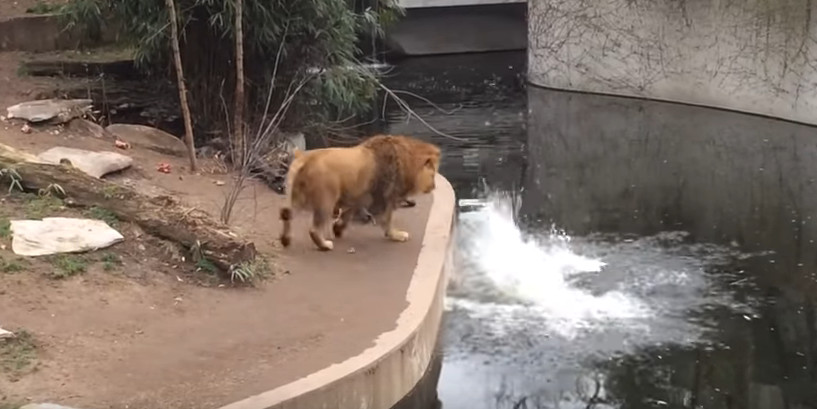 兩獅走著走著,走在前方的獅子開始注視著遠方,欣賞周圍的風景,不過,牠沒有注意到牠已經太靠近水泥邊緣了,只見牠慢慢往水邊走,完全不知道自己已經快要掉下去,結果下一秒右腳一個「撲空」,這隻獅子嚇了一跳,全身還抖了一下,牠原本想試著用其他腳撐住身體,不過看樣子牠的平衡感沒有很好,最後還是「撲通」一聲掉進水中,激起大大的水花。