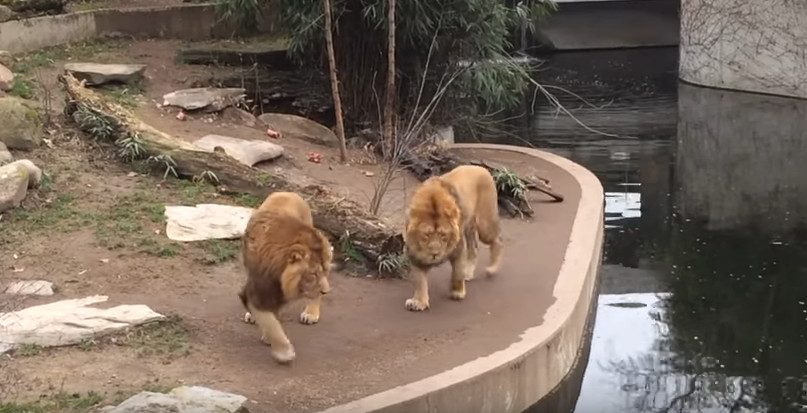 有網友就在德國一個動物園拍到兩隻獅子正在水泥圍籬邊緣走著,就像兩個會邊散步邊聊天的朋友一樣,這兩隻獅子一前一後慢慢走著,看起來十分愜意。「今天天氣不錯!」「對啊,很多蠢人類又在上面拍我們了。」
