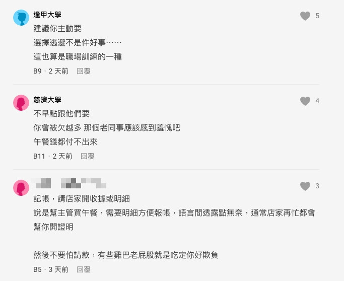 原PO指出,買完午餐回來後,B都會說「我等一下給妳」,每次卻要等很久,有時甚至沒付錢,次數多達4至5次,「礙於他年紀比較年長,我都不敢開口要。我又不是特別的有錢,就算有錢也不是這樣的吧!好困擾,想問大家怎麼辦?」