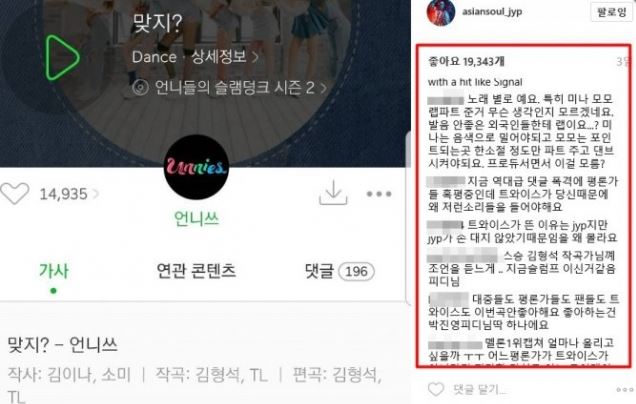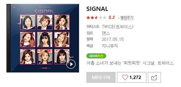 據悉,截至韓國時間昨晚上7點,《SIGNAL》在大型音源網Melon已跌到第4名,近2萬3千名網友評價僅2.4分 (總分5分);雖然在Naver Music穩坐冠軍,但評分僅得5.2分 (總分10分)。