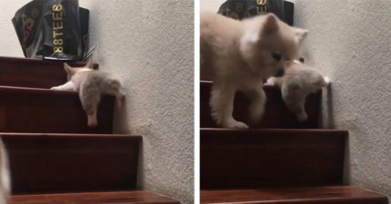 小柯基上樓梯!奮力向上爬呀爬 博美嬌傲走下來:噢,腿太短我幫不了你