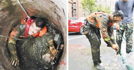 老奶奶剪路邊野花「一腳摔進化糞池」 帥氣消防員跳下喊:踩著我肩膀上去吧!
