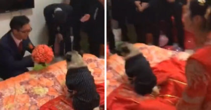 新郎捧花提親 巴哥「擋在新娘前給下馬威」網笑:真正的岳父!