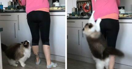 中二屁猫「把主人当跳台」 攀爬瞬间地心引力失衡:不行本王太重了…