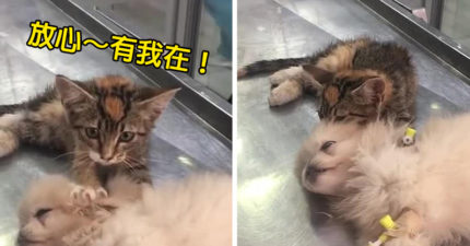療癒片/狗狗躺著打點滴…小小貓「用肉球踏踏幫按摩」 兄弟你要快點好起來QQ