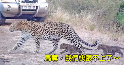 影/男子巧遇「花豹媽帶寶寶」過馬路 牠走到一半耍賴:累了啦~