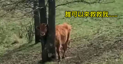 小牛「頭卡在樹裡」出不來 巧遇「遠足父子」結局超暖!