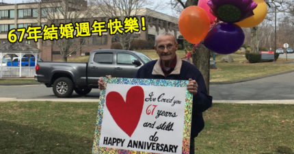 因武肺被隔離!爺爺在療養院外「舉牌+氣球」向妻子示愛:我愛你67年了❤