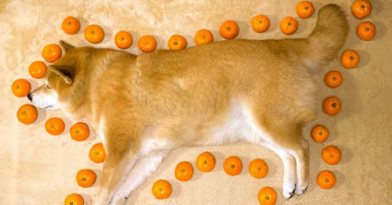 網紅柴「用蜜柑算身長」萌翻網友 主人趁牠「睡爽爽」完成任務:40顆搞定❤