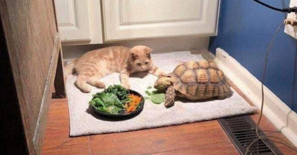 慢到沒朋友!橘貓等「烏龜吃完飯」去玩耍 等到一半「斷電」:我先睡一下